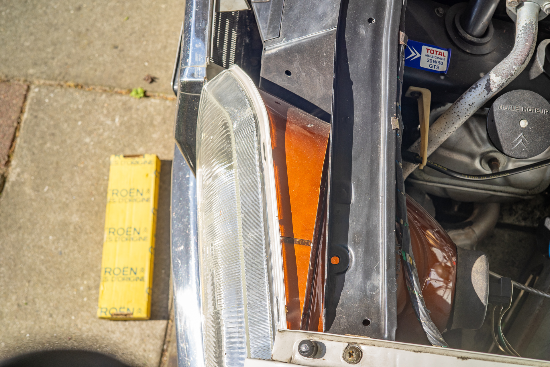 It was time to install a new Cibié headlight on the left side of the car. The right side had already been replaced, and now with a matching pair of fresh headlights, the front really stands out. I also fitted new blinker light reflector glasses—what makes them extra special is that they came in their original Citroën spare parts boxes. There’s something uniquely satisfying about installing parts that have been sitting on a shelf for 30, maybe even 40 years. These treasures came from the warehouse of the Dutch GS Club.